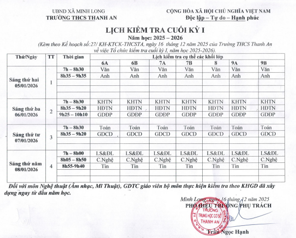 Lịch kiểm tra cuối học kì 1, Năm học 2025-2026