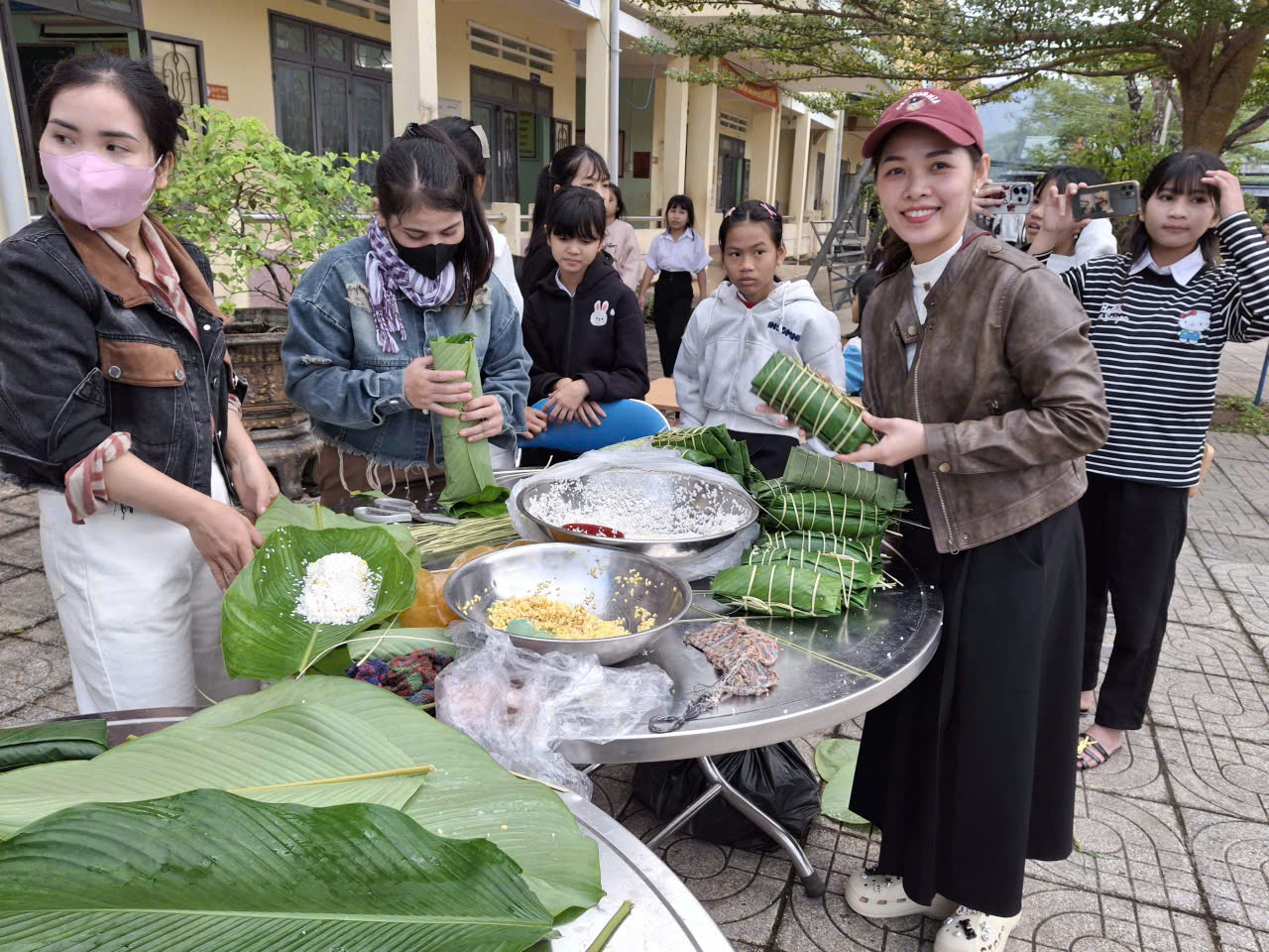 Tại chương trình, học sinh được trực tiếp tham gia gói bánh tét, tìm hiểu ý nghĩa của món bánh truyền thống ngày Tết. Bên cạnh đó, các em còn hào hứng tham gia 2 trò chơi sôi nổi là Đi xe đạp chậm và Đẩy gậy, tạo nên không khí thi đua vui tươi, đoàn kết.